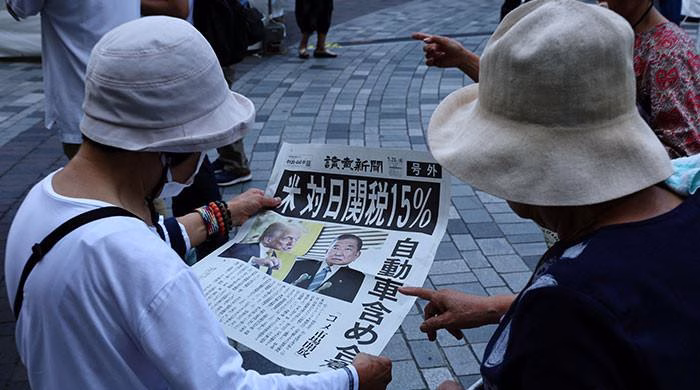 People react as they read a special edition of Yomiuri Shimbun newspaper reporting the tariff deal agreement between US and Japan, in Tokyo on July 23, 2025. — ReutersTariffs on Japanese goods cut to 15% from 25%Japanese stocks jump, yen strengthens against dollar.Tokyo to increase…
