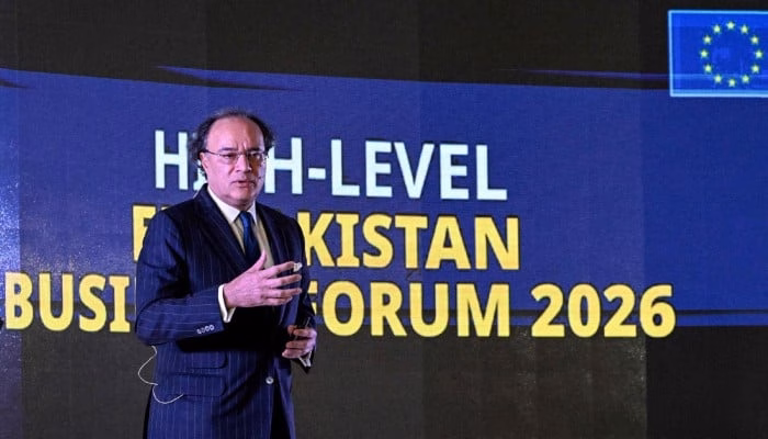 Federal Minister for Finance and Revenue, Senator Muhammad Aurangzeb, speaks during the High-Level European Union-Pakistan Business Forum in Islamabad on April 28, 2026. — AFPGovt focusing on commercial financing for economic needs: FinMin.Says remittances stable, including from UAE…