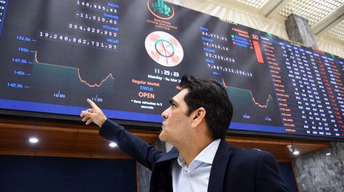 An investor monitors a digital board showing share prices at the Pakistan Stock Exchange in Karachi on March 9, 2026. — OnlineKSE-100 Index settled at 153,866.16, down 555.27 points, or 0.36%.Index hit intraday high of 155,002.1, up 580.67 points, or 0.38%.Index recorded a low of…