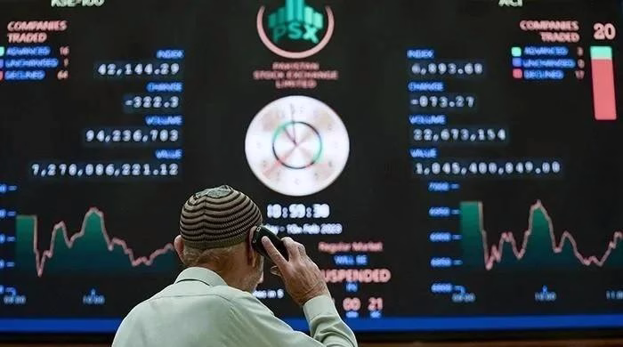 A broker talks on phone as he looks at an index board showing the latest share prices at the PSX in Karachi on February 10, 2023. — AFPKSE-100 Index closed at 137,964.81 points, down 1.02%.Index touched intraday low of 137,636.37, dropping 1.25%.Session’s high recorded at 140,331.01,…